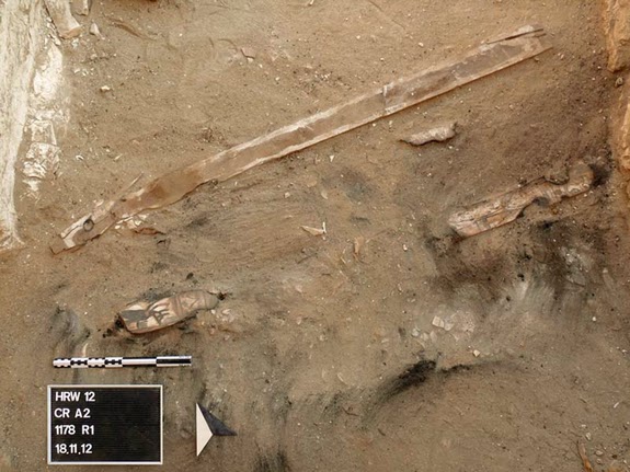 | Υπολείμματα από παλιά ξύλινα φέρετρα που χρησιμοποιήθηκαν για να τροφοδοτήσουν τους κλιβάνους. Στη φωτογραφία φαίνεται ένα εν μέρει καμένο φέρετρο που χρονολογείται στο δεύτερο αιώνα μ.Χ. |