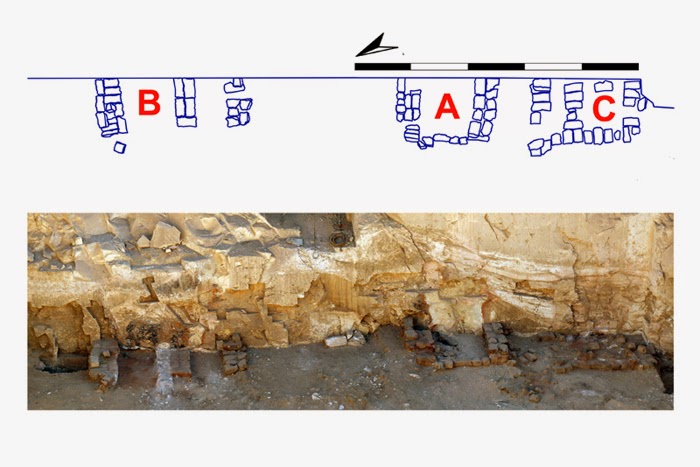 | Για να δημιουργήσουν αρκετό ασβέστη χτίστηκαν τρεις ασβεστοκάμινοι κατά μήκος του τοίχους της ανατολικής αυλής. Η φωτογραφία δείχνει μια πανοραμική όψη και σχέδιο τους. |