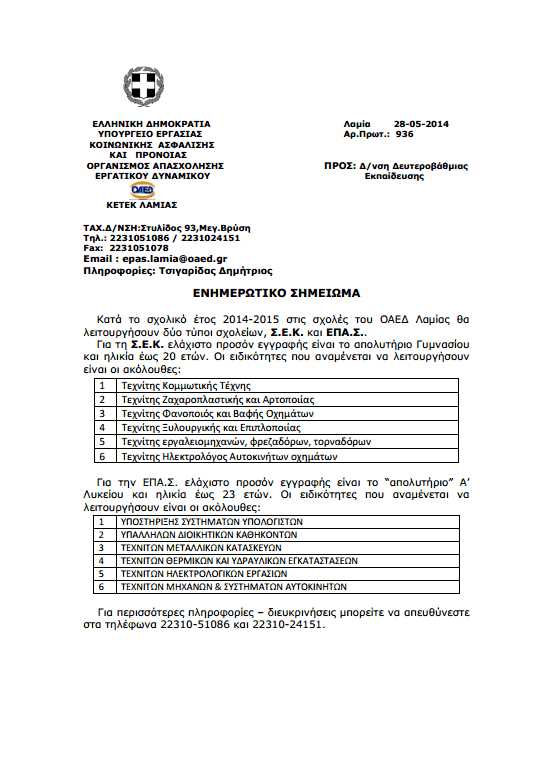 Οι ειδικότητες που θα λειτουργήσουν στις σχολές του ΟΑΕΔ Λαμίας