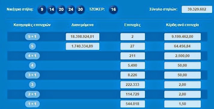 Οι αριθμοί που κληρώθηκαν ήταν 9, 14, 20, 24, 30 και αριθμός τζόκερ το 16.
