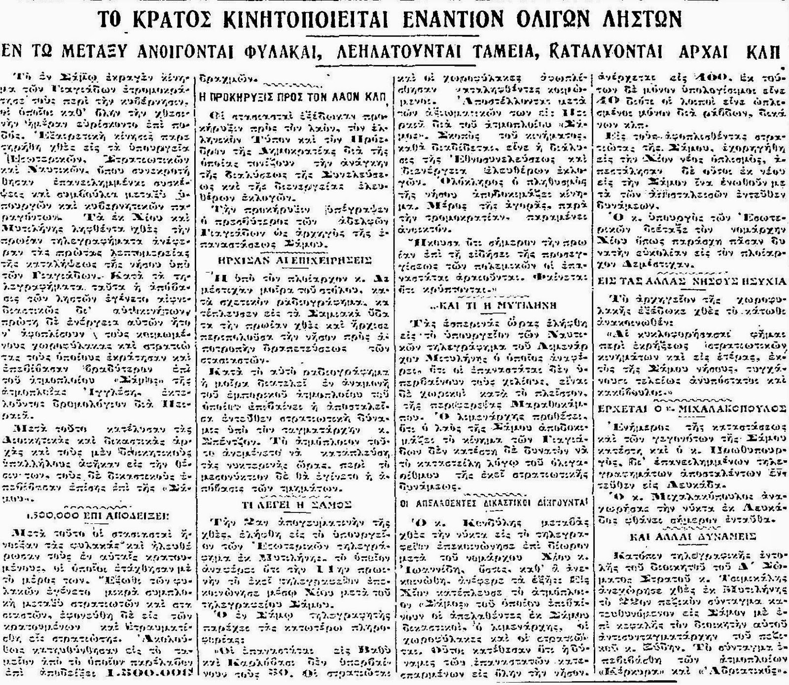 Στην Αθήνα, οι Αρχές έμαθαν τις εξελίξεις την Κυριακή το πρωί από συγκεχυμένα τηλεγραφήματα από την Χίο και την Μυτιλήνη όπου είχε μεταβεί ο Χριστακόπουλος και ο οποίος ανεβίβαζε τους στασιαστές σε 2000 άτομα. Το νέο έσκασε σαν βόμβα στην Αθήνα και αποτέλεσε ένα ισχυρό σοκ για την κοινή γνώμη. Οι φιλοκυβερνητικές εφημερίδες κατηγόρησαν τους βασιλόφρονες για την εξέγερση λόγω του πολιτικού παρελθόντος των Γιαγιάδων, ενώ οι αντιβενιζελικές εφημερίδες δεν υιοθέτησαν το κίνημα, αλλά υπογράμμιζαν το πλήρες ξεχαρβάλωμα και την ταπείνωση του κράτους από μια ομάδα ληστών. Είναι αναμφίβολο πως τα νέα αιφνιδίασαν την κυβέρνηση, αλλά ο Κονδύλης, με μεγάλη εμπειρία στην διαχείριση κρίσεων, αντέδρασε ακαριαία κηρύσσοντας τον στρατιωτικό νόμο στο νησί και κινητοποιώντας τον κρατικό μηχανισμό. Δεν έστειλε καμία μονάδα από την Χίο η την Μυτιλήνη που δεν ενέπνεαν εμπιστοσύνη για την μαχητικότητα τους, αλλά απέστειλε μια μικτή δύναμη 1.0000 ανδρών από τις μονάδες των Αθηνών που ήταν οι πλέον πιστές στην κυβέρνηση, με την στήριξη ενός στολίσκου αποτελούμενου από τα αντιτορπιλικά "Λέων" και "Ιέραξ", "Αετός" και τα ανιχνευτικά "Σφενδονή" και "Βέλος", ενώ δόθηκε διαταγή να ετοιμαστεί και ο "Αβέρωφ" για παν ενδεχόμενο. Η όλη δύναμη τέθηκε υπό τις διαταγές του πλοιάρχου Ιωάννη Δεμέστιχα, ενός ικανού ναυτικού που ενήργησε με ικανότητα, αποκλείοντας το νησί με τον στόλο που διέθετε.