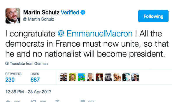 Ο πρόεδρος της Ευρωπαϊκής Επιτροπής Jean-Claude Juncker "επίσης συνεχάρη τον Μακρόν για το αποτέλεσμά του στον πρώτο γύρο και του εύχεται το καλύτερο για τον επόμενο γύρο", δήλωσε ο Έλληνας εκπρόσωπος του Juncker και «δεξί του χέρι», Μαργαρίτης Σχοινάς.