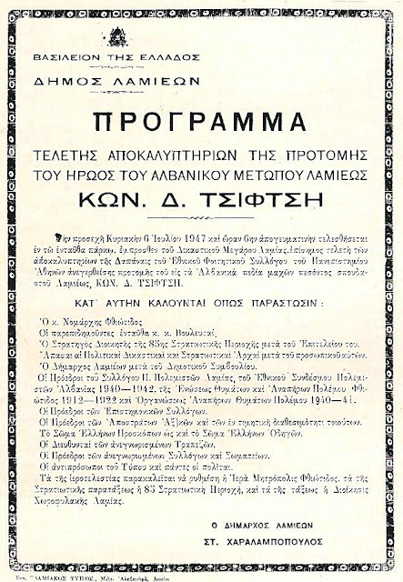 [Έτος 1947: πρόγραμμα τελετής αποκαλυπτηρίων της προτομής του εφέδρου ανθυπολοχαγού Κωνσταντίνου Δ. Τσιφτσή. Από το βιβλίο «Δημητρίου Θ. Νάτσιου, Οι Δήμαρχοι της Λαμίας (1836-1996), Λαμία 1996, σελίδα 44». Η προτομή υπάρχει και σήμερα δίπλα στα δικαστήρια.]