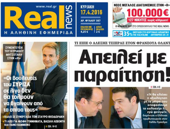 Με τίτλο "Απειλεί με παραίτηση!" κυκλοφορεί αυτήν την Κυριακή η Realnews, αποκαλύπτονας το παρασκήνιο της συνάντησης του Πρωθυπουργού, Αλέξη Τσίπρα, με τον Γάλλο Πρόεδρο, Φρανσουά Ολάντ.