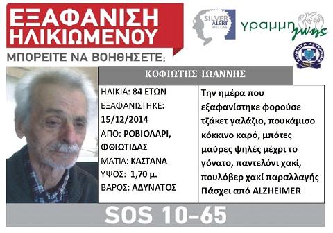 Από τις 15 Δεκεμβρίου αγνοείται η τύχη του 84χρονου Ιωάννη Κοφιώτη από το Ροβολιάρι Φθιώτιδας. Όποιος γνωρίζει κάτι μπορεί να τηλεφωνήσει στην γραμμή ζωής 1065.
