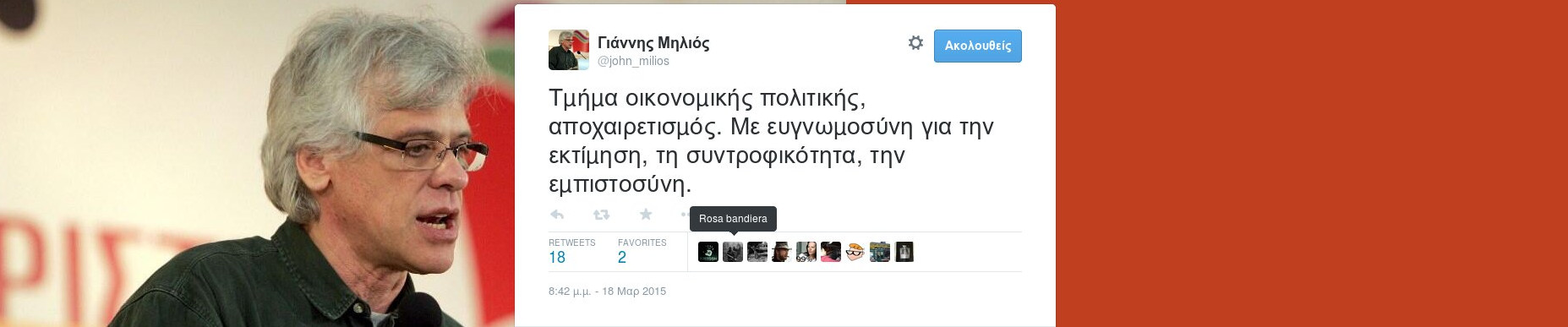 Φαίνεται ότι οι ανέφελες ημέρες που διήνυσε ο οικονομολόγος με την Κουμουνδούρου ανήκουν οριστικά στο παρελθόν. Ο Γιάννης Μηλιός με μια ανάρτησή του στον προσωπικό του λογαριασμό στο twitter, λίγο πριν τις 9 το βράδυ της Τετάρτης αποχαιρέτησε το τμήμα οικονομικής πολιτικής. ««Τμήμα οικονομικής πολιτικής, αποχαιρετισμός. Με ευγνωμοσύνη για την εκτίμηση, τη συντροφικότητα, την εμπιστοσύνη» έγραψε χαρακτηριστικά.